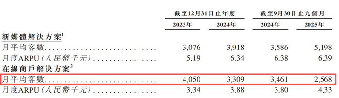 作为公司报告期内的第二大业务,再惠在线商户解决方案的月平均客数呈现持续下降趋势。该指标从2023年的4050位下降至2024年的3309位,并在2025年前三季度进一步下降至2568位。