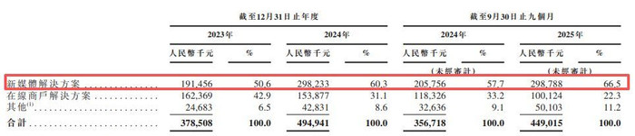 具体来看,2023年、2024年和2025年前三季度(以下简称报告期内),再惠的主要收入来自新媒体解决方案、在线商户解决方案和其他,其中新媒体解决方案为公司核心业务,收入占比分别为50.6%、60.3%和66.5%。